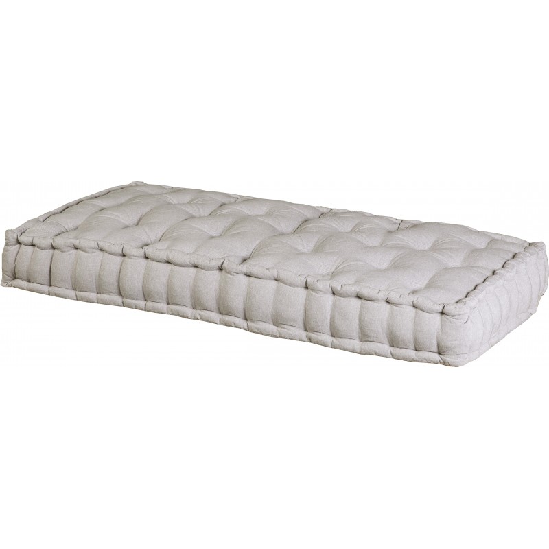 Grey pallet cushion in chambray linen-look fabric, designed to dress standard pallet seating.