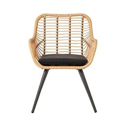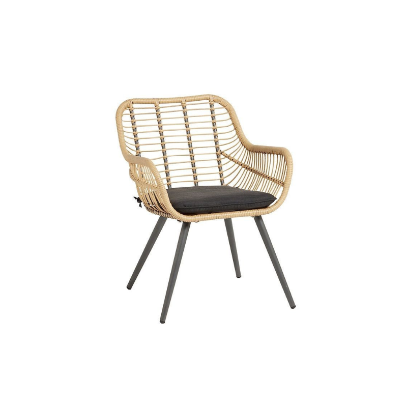 Armchair with black aluminium frame and rattan detailing, featuring a black cushion.