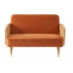 Ochre velvet sofa with stylish cane armrests.